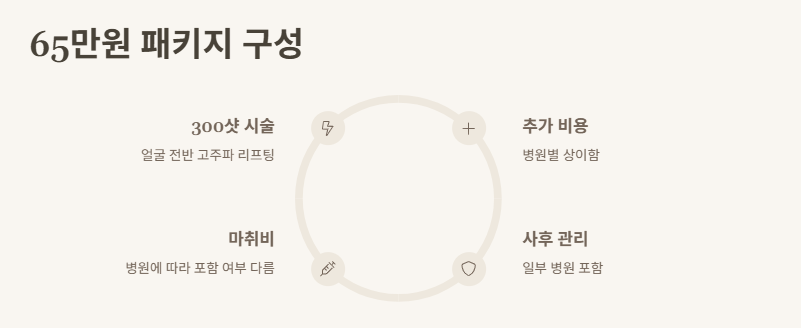 A1. 덴서티 65만원 패키지는 보통 300샷 기준으로, 얼굴 전반에 고주파 리프팅 효과를 제공합니다. 추가 비용이 발생할 수 있으며, 병원에 따라 사후 관리나 마취비가 포함될 수 있습니다.