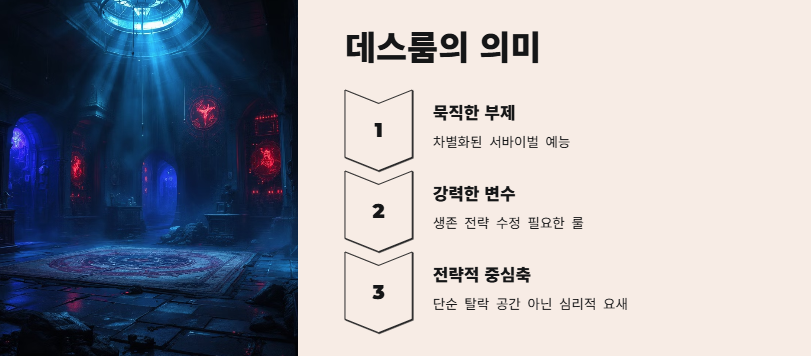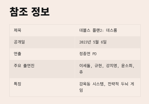 이번 시즌의 부제는 <데블스 플랜: 데스룸>. 이 ‘데스룸’이라는 단어에서 오는 묵직함은 기존 서바이벌 예능과는 차별화되는 느낌을 준다. 실제로 “데블스 플랜2 감옥동 룰”을 보면, 단순한 벌칙이 아닌 플레이어의 생존 전략을 전면 수정하게 만들 만큼 강력한 변수다. 티저에서도 정종연 PD가 “이제는 감옥이 전략적 중심축이 될 것”이라 말했듯, 데스룸이 단순히 탈락의 공간이 아닌 심리적 요새가 될 수 있다는 점은 매우 흥미롭다.
