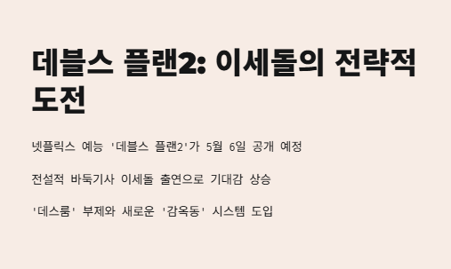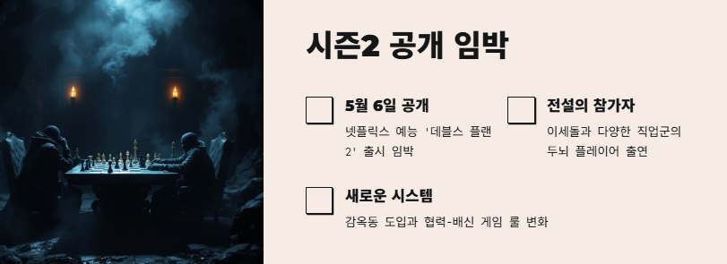 넷플릭스 예능 <데블스 플랜2>가 오는 5월 6일 공개를 앞두고 있다. '데스룸'이라는 부제를 단 시즌2는 전설의 바둑기사 이세돌과 다양한 직업군의 두뇌 플레이어들이 출연하며 기대를 모은다. 감옥동이라는 새로운 시스템, 협력과 배신이 엇갈리는 게임 룰 등으로 팬들의 관심이 집중되고 있다. 시즌1의 인기를 넘어설 수 있을지 귀추가 주목된다.