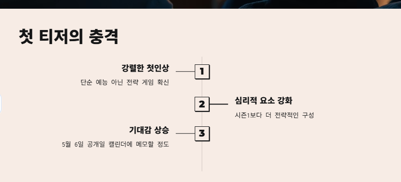 넷플릭스에서 데블스 플랜 시즌2의 티저를 처음 접했을 때, 강렬한 인상이 남았다. 특히 “데블스 플랜2”라는 제목에서 풍기는 묘한 긴장감은 단순한 리얼리티 예능이 아니라는 확신을 주었다. 시즌1을 재미있게 본 사람으로서, 시즌2 예고편은 더 전략적이고 심리적인 요소가 강화된 느낌이었다. 특히 “데블스 플랜2 넷플릭스 공개일”이 5월 6일이라는 소식에 캘린더에 바로 메모해둘 만큼 기대감이 컸다.