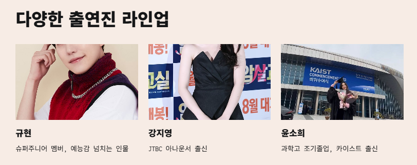 “데블스 플랜2 규현 출연” 소식도 팬들에게 반가운 소식이었다. 슈퍼주니어 멤버이자 예능감 넘치는 인물인 만큼, 냉정한 두뇌 게임에서 어떤 모습을 보여줄지 기대된다. JTBC 아나운서 출신 강지영과 과학고 조기졸업-카이스트 출신 윤소희, 그리고 ‘엄브렐러 아카데미’의 저스틴 H. 민까지. 다채로운 배경을 가진 플레이어들이 “데블스 플랜2 출연진”이라는 사실만으로도 몰입감이 배가된다.