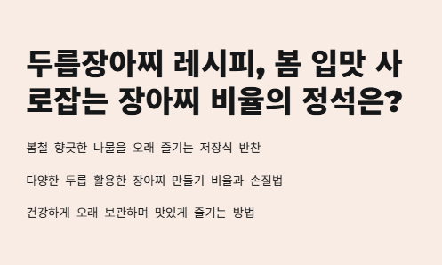 두릅장아찌 레시피는 봄철 향긋한 나물을 오랫동안 즐길 수 있는 저장식 반찬 중 하나입니다. 이 글에서는 참두릅, 땅두릅, 개두릅 등 다양한 두릅을 활용한 장아찌 만들기 비율과 손질법, 실패 없는 데치기 팁까지 정리했습니다. 집밥 전문가로서 직접 만들어본 경험을 바탕으로, 건강하게 오래 보관하며 맛있게 즐길 수 있는 두릅장아찌 간장 레시피를 소개합니다.