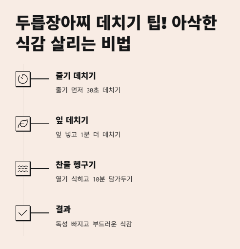 저만의 팁은 줄기를 먼저 30초, 이후 잎을 넣고 1분 정도 더 데치는 방식입니다. 데친 뒤 찬물에 헹궈 열기를 식히고 10분 정도 담가두면 독성이 빠지고 더욱 부드럽습니다.