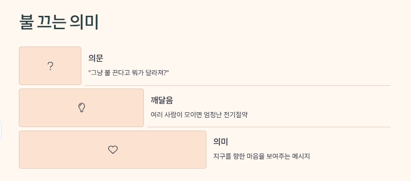 진짜 나도 처음엔 “그냥 불 끈다고 뭐가 달라져?” 싶었어요. 근데 생각해보면, 전등 하나 안 켠 게 여러 사람들과 모이면 엄청난 전기절약이고, 탄소 배출도 줄이는 거잖아요.