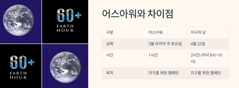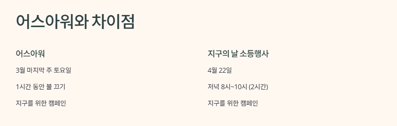 지구의 날 소등행사는 4월 22일 저녁 8시부터 10시까지 하는 거고, 둘 다 지구를 위한 캠페인인 건 똑같지만 날짜랑 분위기가 살짝 다르더라고요.