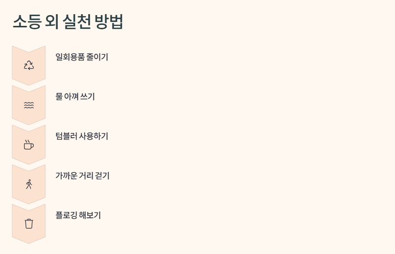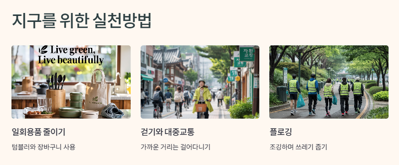 일회용품 줄이기, 걷기 생활화, 대중교통 이용, 플로깅 등 생활 실천 가능!