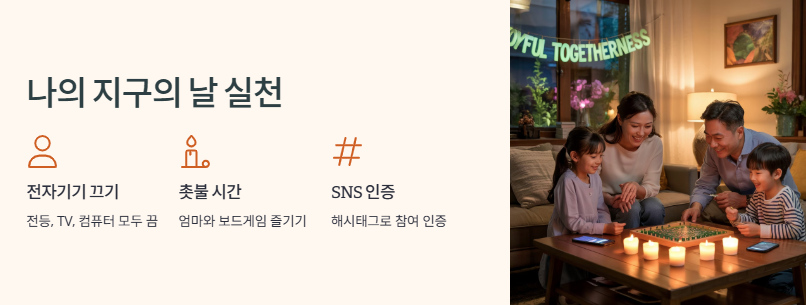나는 이날, 집에 있는 전등이랑 TV, 컴퓨터 다 껐어요. 엄마랑 촛불 켜고, 평소엔 안 하던 보드게임도 했어요! 스마트폰도 잠깐 꺼두고, 그냥 이야기 나누는 시간도 가졌는데 진짜 좋았어요.