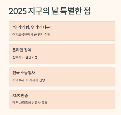 올해는 “우리의 힘, 우리의 지구”라는 주제로 서울 여의도공원에서 큰 행사가 열렸어요! 나는 직접 가지는 못했지만, 온라인에서도 참여할 수 있어서 집에서 실천했어요. 서울뿐만 아니라 전국적으로 저녁 8시부터 10시까지 소등행사가 있었어요. 우리 동네는 살짝 조용했지만, SNS에서는 인증샷 올리는 사람들 되게 많았어요.