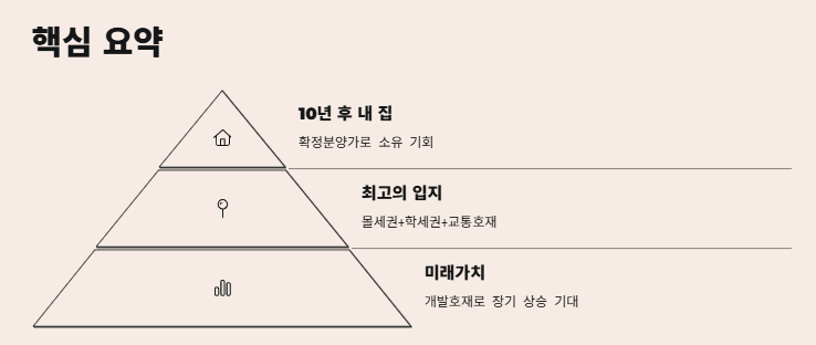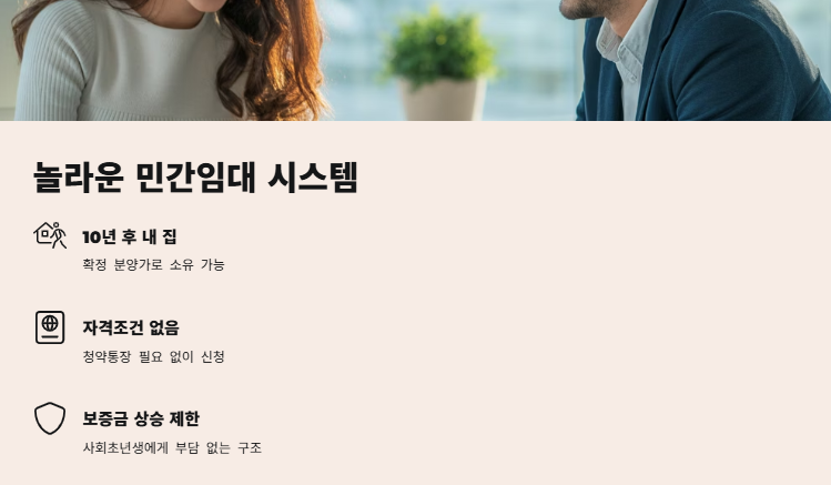자격요건 없이 입주 가능하고, 10년 후 확정분양가로 내 집 마련 기회를 제공합니다. - 입지 프리미엄이 장점