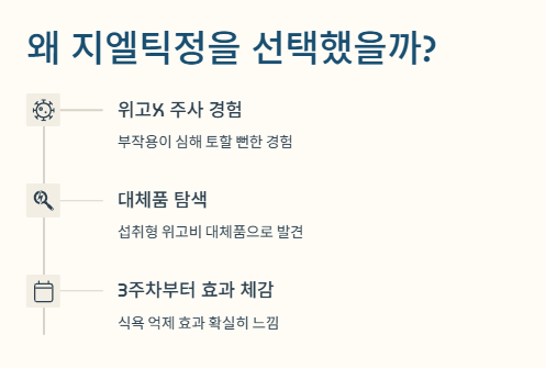 사실 나도 처음엔 ‘그냥 또 하나의 다이어트 제품이겠지’ 했어. 근데 예전엔 위고X 주사 맞았었거든? 근데 그건 부작용이 너무 심해서 하루는 토할 뻔하고 그랬어… 그래서 찾다가 ‘섭취형 위고비 대체품’으로 지엘틱정을 알게 됐지.
