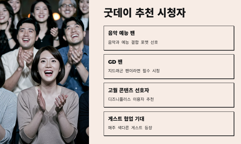블로그 이웃들이나 엄마 모임에서도 ‘굿데이 봤어?’라는 얘기가 종종 오갔어요. 특히 GD의 복귀작이라는 점, 김태호 PD 연출이라는 점, 그리고 디즈니 플러스 독점이라는 프리미엄이 합쳐지면서 30~40대 시청자들에게도 큰 이슈가 되었죠. 단순한 예능이 아니라, 하나의 음악 프로젝트를 보는 느낌이라 더 몰입이 됐습니다.
