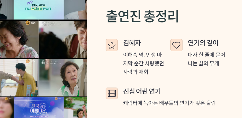 JTBC ‘천국보다 아름다운’ 출연진은 단순히 유명 배우의 나열이 아닙니다. 캐릭터에 녹아든 배우들의 진심 어린 연기가 시청자에게 깊은 울림을 줍니다. 김혜자는 이해숙 역으로 인생의 마지막 순간, 가장 사랑했던 사람과의 재회를 섬세하게 그려냅니다.