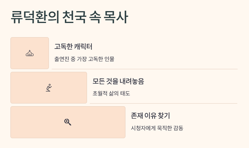 목사 역을 맡은 류덕환은 ‘천국보다 아름다운’의 출연진 중 가장 고독한 캐릭터를 연기합니다. 모든 것을 내려놓고 살아가는 인물로, 천국이라는 공간 속에서 존재 이유를 찾아가는 그의 모습은 시청자들에게 묵직한 감동을 줍니다.