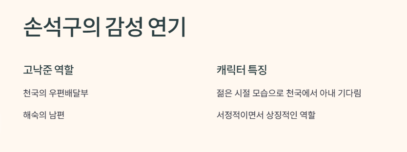 ‘천국보다 아름다운’의 출연진 중 손석구는 단연 인상적인 캐릭터 고낙준 역을 맡았습니다. 천국의 우편배달부이자 해숙(김혜자 분)의 남편으로서, 젊은 시절의 모습으로 천국에서 아내를 기다립니다. 천국보다 아름다운 출연진 중에서도 그의 역할은 가장 서정적이면서도 상징적입니다.