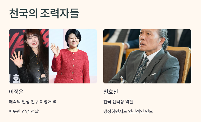 ‘천국보다 아름다운’ 출연진에는 믿고 보는 배우 이정은과 천호진도 빠질 수 없습니다. 이정은은 해숙의 인생 친구 이영애 역으로 등장해 따뜻한 감성을 전달하고, 천호진은 천국의 질서를 유지하는 센터장으로 냉정하면서도 인간적인 면모를 보여줍니다.