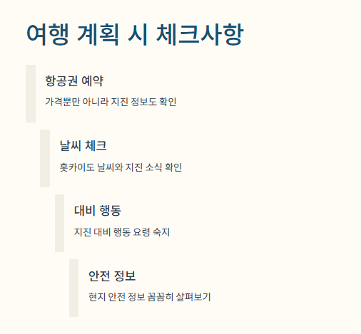 나는 여행 가기 전에 홋카이도 항공권 예약할 때 지진 같은 건 전혀 생각 못 했었거든. 보통 우리가 여행지 고를 때 홋카이도 날씨나 맛집 정보만 보잖아? 근데 이번 경험을 통해 느낀 게, 앞으로는 꼭 지진 발생 지역인지도 한 번 체크해보는 게 좋겠더라구.