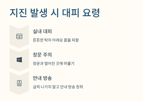 튼튼한 탁자 아래로 몸을 피하고, 창문과 떨어진 곳에서 머물러야 합니다. 건물 밖으로 급히 나가지 말고 안내 방송을 잘 들어야 해요.