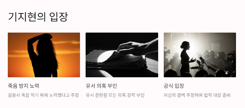 기지현은 자신이 김웅서의 죽음을 막기 위해 노력했다고 주장하며, 유서와 관련된 의혹을 부인하고 있습니다.