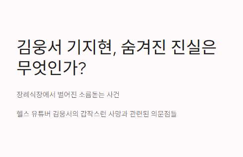 헬스 유튜버 김웅서의 갑작스런 사망과 관련된 사건은 단순한 사고사로 보기에는 너무 많은 의문을 남겼어요. 특히 기지현과의 복잡한 관계, 유서의 공개와 삭제, 그리고 장례식장에서 벌어진 충격적인 사건들까지. 이번 글에서는 1. 김웅서 사망 전후의 충격적인 일들 2. 유서와 기지현의 관계 3. 가족과 기지현의 갈등을 다루며 숨겨진 진실을 밝혀보려 해요.