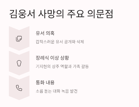 김웅서의 유서와 장례식장에서의 이상한 상황, 그리고 기지현과의 통화 내용이 의문을 남깁니다.