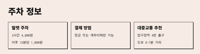 - 🚘 발렛 가능 (2시간 4,000원, 이후 15분당 1,000원)