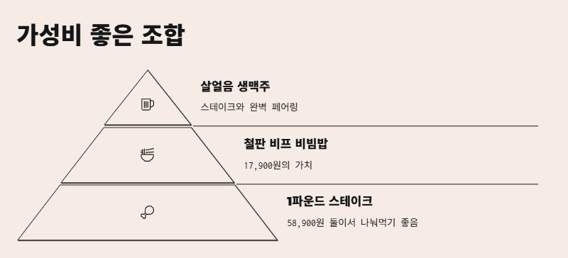 1파운드 스테이크 + 철판 비프 비빔밥 + 살얼음 생맥주 콤보 추천!