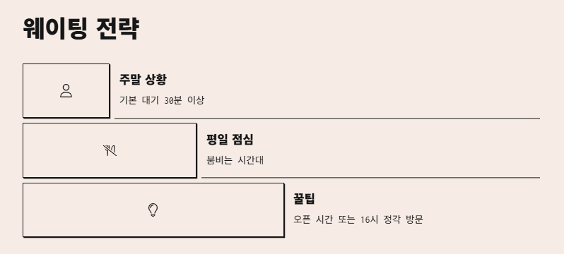 그건 바로 웨이팅 때문! 주말엔 기본 대기 30분 넘고요, 평일에도 점심 시간은 붐벼요. 그래서 저는 요즘 아예 오픈 시간에 맞춰서 가거나 16시 정각에 맞춰 들어가요. 브레이크타임 끝나자마자! 웨이팅 없이 입장 성공✌️