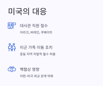 대사관 철수 조치, 미군 가족 이동 허용 등 조심스러운 대응을 하며 이스라엘을 지지하는 입장입니다.
