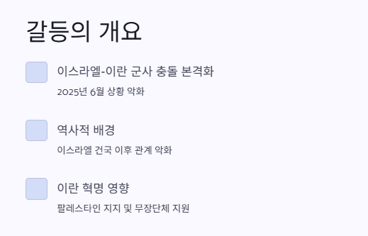 2025년 6월 이스라엘과 이란 사이의 군사 충돌이 본격화되면서 전 세계의 이목이 집중되고 있어요. 이 글에서는 왜 이스라엘과 이란이 갈등하게 됐는지, 그 역사적 배경부터 최근 핵시설 공습까지 전반적인 내용을 쉽게 풀어볼게요.