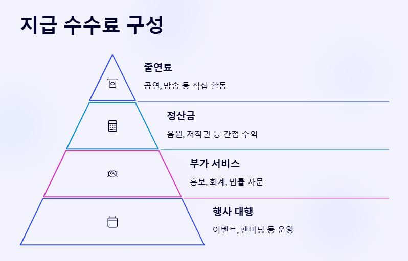 출연료, 정산금 외에도 홍보, 회계, 법률 자문, 행사 대행 등 다양한 항목이 포함됩니다.