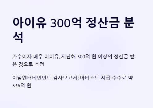 결국 ‘아이유 300억 정산금’은 단기간의 인기 결과물이 아니라, 장기간 쌓아온 신뢰와 커리어의 총합이라고 볼 수 있다.