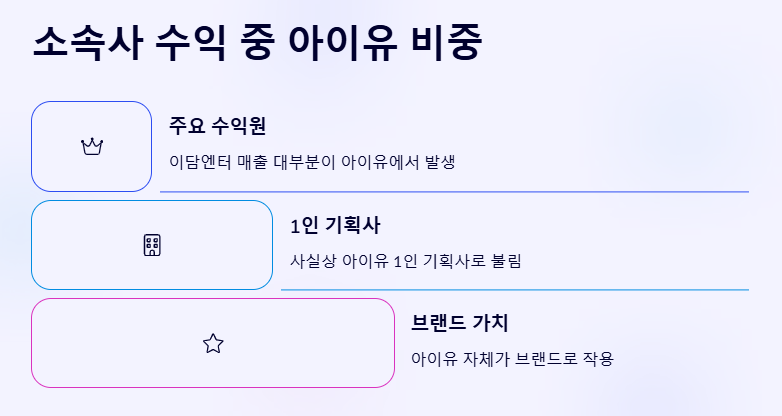 이담엔터 매출 대부분이 아이유에서 나오며, 사실상 아이유 1인 기획사로 불리기도 합니다.