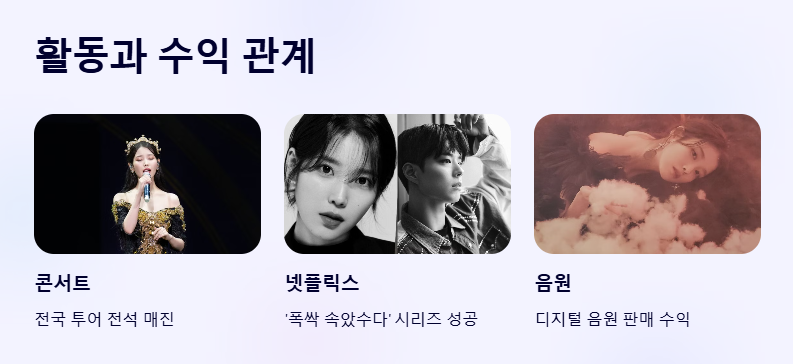 음원, 콘서트, 넷플릭스 드라마 등 다양한 활동을 통해 수익이 크게 증가했고, 소속사 실적 개선에도 큰 기여를 했습니다.