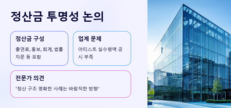 아이유 300억 정산금과 관련한 보도 이후, 업계에서는 연예 기획사의 정산 투명성 문제도 다시금 주목받고 있다. 실제로 정산금에는 단순 출연료뿐 아니라 홍보, 회계, 법률 자문 등 다양한 수수료가 포함되는데, 그 중 아티스트에게 돌아가는 금액이 얼마나 되는지에 대한 정확한 공시는 드문 편이다.