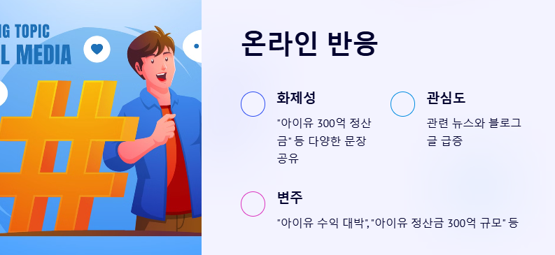 이 소식이 알려지면서 다양한 형태의 문장이 온라인상에 공유되고 있다. "아이유 300억 정산금", "아이유 지난해 수익 300억", "아이유 수익 대박", "아이유 지급액 300억", "아이유 정산금 300억 규모", "아이유 작년 수익 300억 추정", "아이유 연예인 정산금 300억", "아이유 수익 공개 300억", "아이유 이담 정산금 300억", "아이유 수익액 300억 이상" 등 수많은 변주가 생기며 관련 뉴스와 블로그 글들이 쏟아지고 있다.