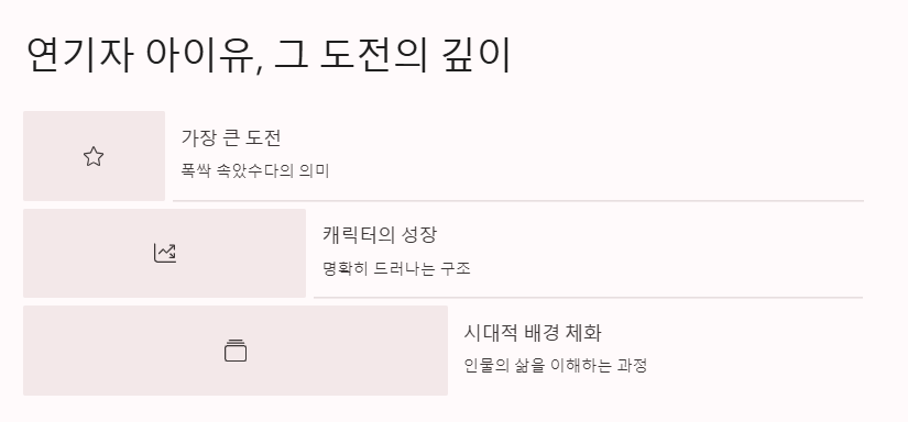 사실 아이유는 과거에도 진중한 캐릭터를 연기한 바 있다. 하지만 '폭싹 속았수다'는 그 중에서도 가장 큰 도전이었다. 특히 이번 작품은 캐릭터의 성장이 명확하게 드러나는 구조로 설계돼 있었기에, 배우로서의 역량이 더욱 부각될 수밖에 없었다. 아이유는 단순히 감정을 연기하는 것을 넘어, 시대적 배경과 인물의 삶을 체화하는 데 집중했다.
