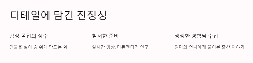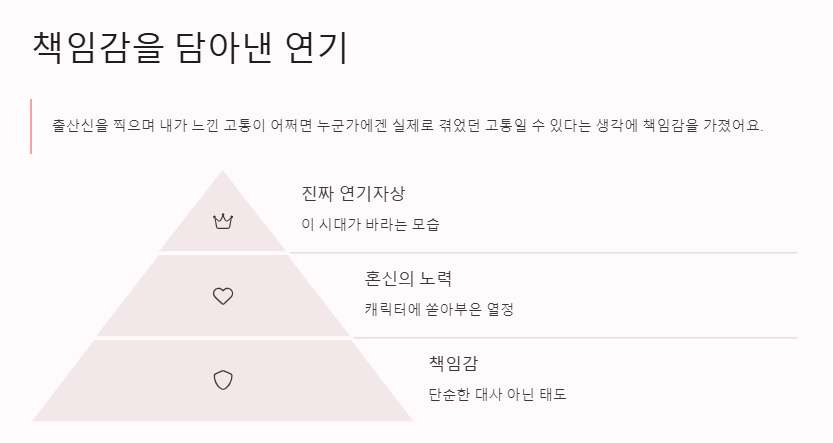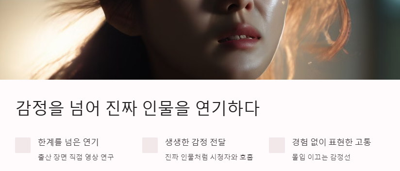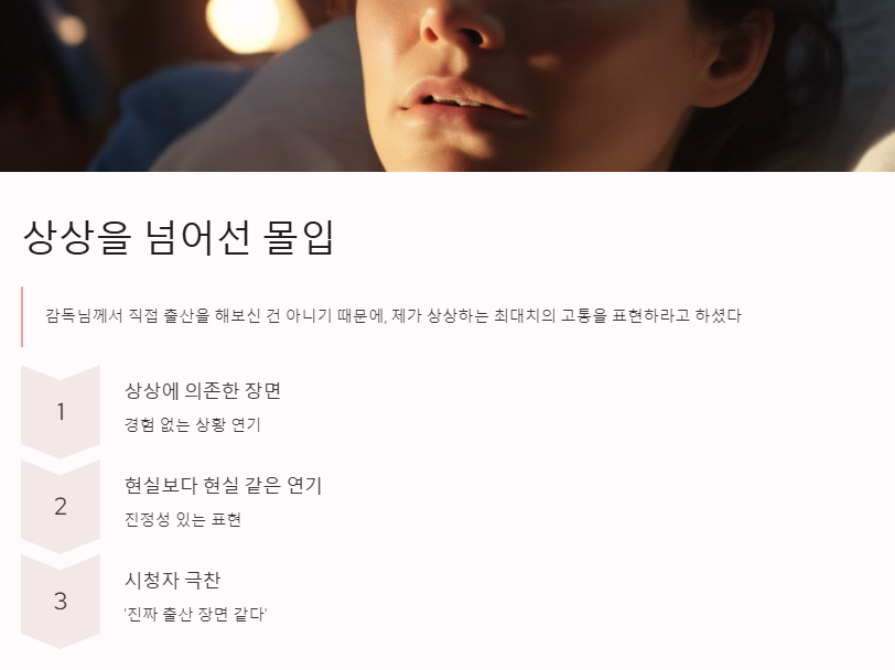 인터뷰에서 “감독님께서 직접 출산을 해보신 건 아니기 때문에, 제가 상상하는 최대치의 고통을 표현하라고 하셨다”는 이야기는 그녀가 연기를 대하는 진정성을 그대로 보여준다. 상상에 의존해야 했던 장면에서조차 그녀는 현실보다 더 현실 같은 연기를 해냈다. 시청자들은 그녀의 연기에 ‘진짜 출산 장면을 본 것 같다’며 극찬을 보냈다.