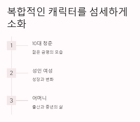 아이유가 맡은 금명이는 드라마 전체를 관통하는 핵심 인물이다. 그녀는 10대 청춘부터 어머니가 되는 중년 여성까지를 동시에 소화해야 했다. 이처럼 다양한 나이대와 감정을 오가는 캐릭터를 연기하는 건 결코 쉬운 일이 아니다. 특히나 출산이라는 신체적·정신적 한계가 극대화되는 순간을 표현하기 위해선 남다른 몰입과 분석이 필요했다. 아이유는 이를 위해 유튜브에서 난산 사례와 순산 사례 등 다양한 출산 과정을 비교 분석하며 자신만의 연기를 준비해갔다.