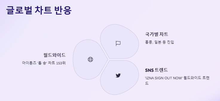 이즈나의 신곡은 국내를 넘어 글로벌 시장에서도 뜨거운 반응을 얻고 있다. 월드와이드 아이튠즈 '톱 송' 차트 153위에 진입했으며, 홍콩, 일본 등의 국가 차트에도 이름을 올렸다. 특히 ‘IZNA SIGN OUT NOW’라는 키워드가 엑스(X, 옛 트위터) 월드와이드 트렌드에 등장하며 글로벌 팬들의 반응을 실감케 했다.