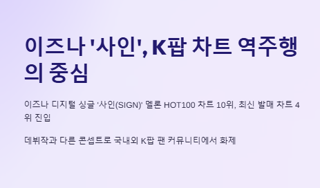 발매와 동시에 이뤄진 차트 진입은 단순한 우연이 아니었다. ‘사인’은 중독성 강한 후렴구와 사랑을 주제로 한 감성적인 가사로 리스너들의 감정을 자극했다. 이즈나는 음악뿐 아니라 퍼포먼스, 비주얼, 무대 연출 등 다방면에서 성장한 모습을 보여주며, 팬층을 확대하고 있다.