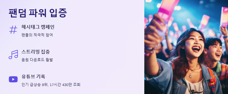 ‘사인’의 차트 성적은 팬덤의 강력한 지지를 증명한 결과다. 팬들은 발매 당일부터 해시태그 캠페인을 펼치며 스트리밍과 음원 다운로드에 적극적으로 참여했다. 그 결과, 유튜브 인기 급상승 동영상 8위, 17시간 만에 조회수 430만 회라는 기록도 달성했다.