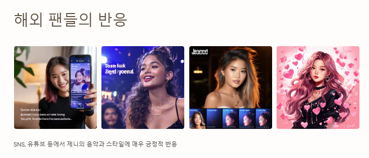 해외 팬들은 SNS, 유튜브 등에서 제니의 음악과 스타일에 대해 매우 긍정적인 반응을 보이고 있습니다.
