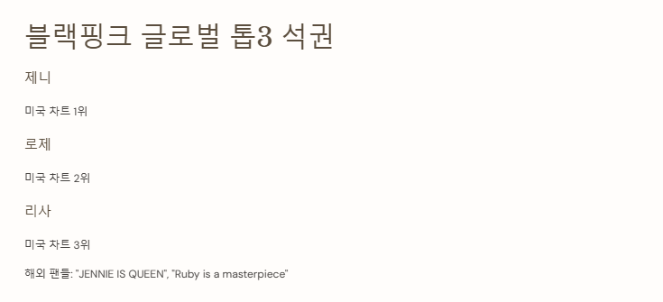 케이팝 차트 속 제니, 블랙핑크 멤버들과 톱3 석권