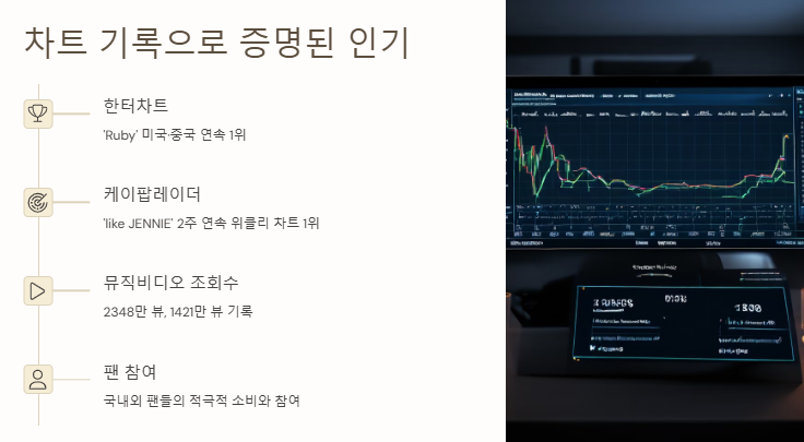 한터차트와 케이팝레이더의 통계도 제니 1위 이유를 뒷받침한다. 한터차트에 따르면 ‘Ruby’는 미국과 중국에서 연속 1위를 차지했고, 케이팝레이더에선 ‘like JENNIE’가 2주 연속 위클리 차트 1위를 기록했다.
