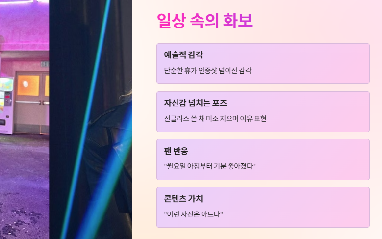그녀의 SNS 게시물은 단순한 휴가 인증샷을 넘어 일상 속에서도 예술적인 감각을 드러냈다.