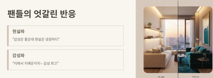 영상 보고 댓글창 보니까 반응이 진짜 다양하더라. 어떤 사람은 “감성은 좋은데 현실은 냉정하다”면서 실용성 없는 인테리어는 안된다고 하고, 또 어떤 팬들은 “이래서 지예은이지~ 감성 최고” 하면서 완전 지지하더라구. 나도 그런 말 들으면 왠지 내 얘기 같아서 괜히 짠했어.