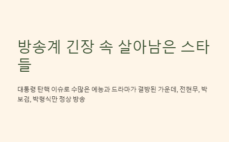 KBS의 ‘더 시즌즈: 박보검의 칸타빌레’는 그간 박보검의 안정적인 진행과 진정성 있는 인터뷰로 시청자들에게 큰 사랑을 받아왔다. 박보검이 등장한 해당 방송은 이날 뉴스 특보 속에서도 시청률 상승을 기록했다. 박형식이 주연으로 활약한 SBS 드라마 ‘보물섬’ 역시 핵심 장면을 담은 13회를 예정대로 방송했다. 그가 맡은 서동주 캐릭터는 시청자에게 깊은 인상을 남기며 탄핵 뉴스 사이에서도 존재감을 잃지 않았다.