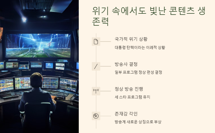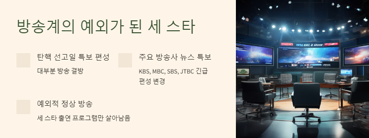 이번 사태는 한편으로는 방송사의 위기 대응력과 동시에 콘텐츠 생존력을 점검해보는 계기가 되었다. 갑작스러운 정치 뉴스와 그로 인한 대규모 편성 변경은 일반적인 시청자들에게도 큰 혼란을 주었다. 하지만 이 가운데에서도 전현무, 박보검, 박형식이 출연하는 프로그램들은 예외적으로 편성되어 시청자들의 공감을 샀다.