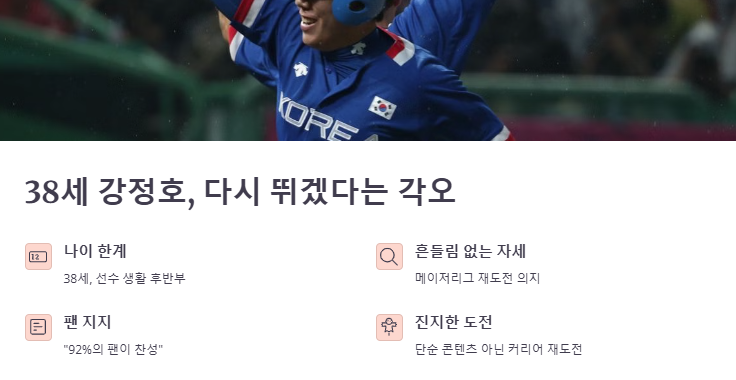 38세라는 나이가 선수 생활 후반부임을 의미함에도 불구하고, 강정호는 흔들림 없는 자세로 메이저리그 재도전에 임하고 있다. 그는 "92%의 팬이 찬성했다"는 통계를 제시하며 자신의 도전을 정당화하고 있다. 이번 복귀 시도는 단순한 유튜브 콘텐츠가 아닌, 진지한 커리어 재도전이라는 점에서 ‘강정호 2025 시즌 복귀 가능성’은 여러 차례 회자되고 있다.