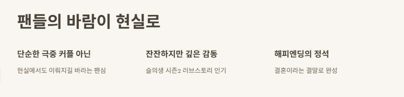 이런 설정보다 팬들에게 더 큰 선물은 없다고 생각해요. 드라마를 사랑한 사람으로서, 마치 내 친구가 결혼한다는 것처럼 흐뭇하고 기뻤답니다.